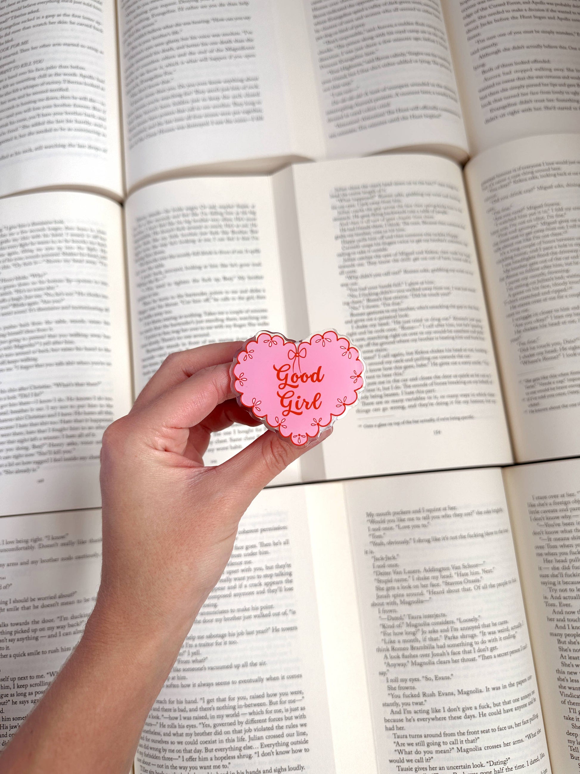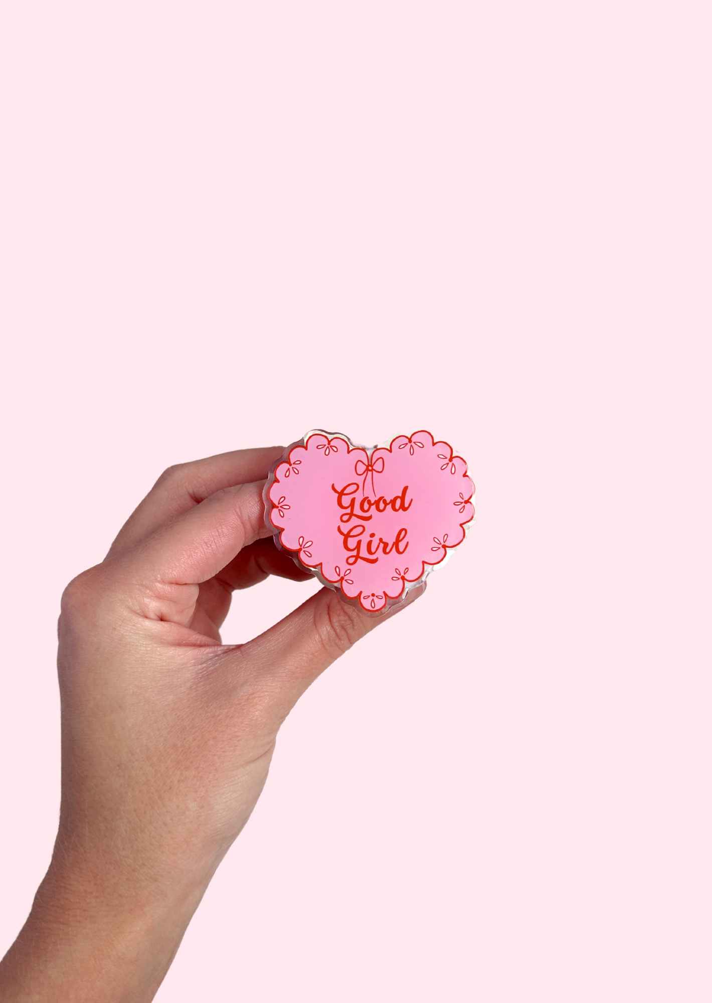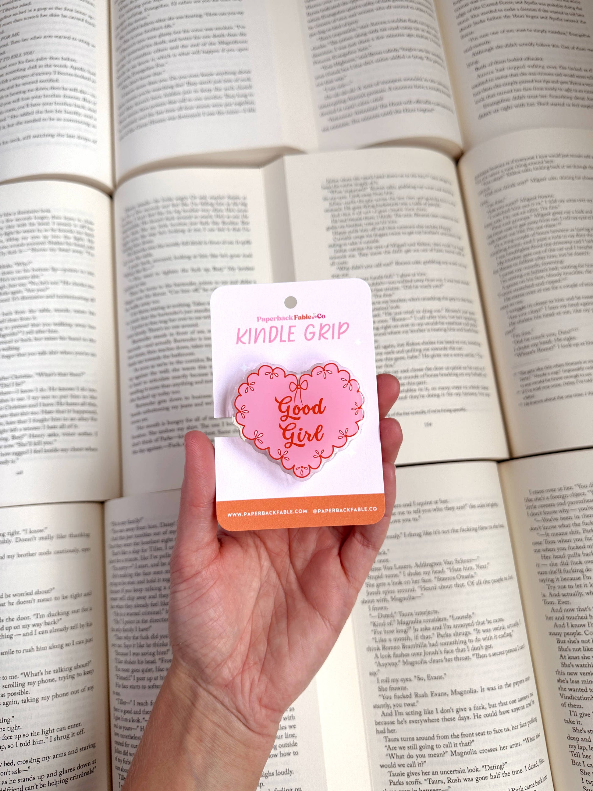 Enhance your Kindle experience with the "Good Girl" Kindle Grip, designed for comfort and secure handling during long reading sessions. Made from durable acrylic with one-sided printing sealed in epoxy, this grip features a collapsible pop socket design that easily flattens for safe storage. Measuring 2.07" x 2.36", it attaches simply by removing the sticker backing and sticking it to your Kindle case or other items. Its ergonomic shape helps reduce hand strain, making your reading time more enjoyable and relaxed.